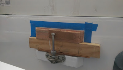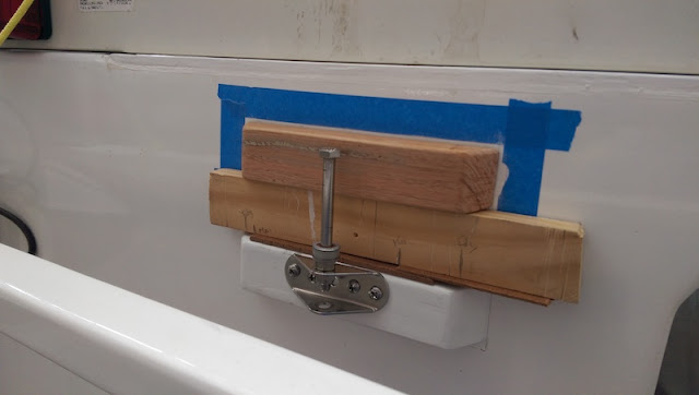 The paintbrush handle is the right size to wedge the new support onto the transom when I epoxy it.
