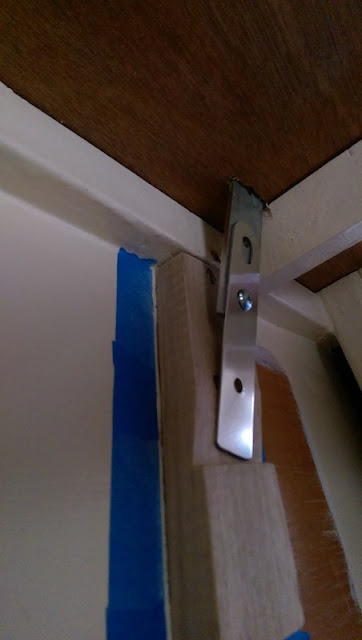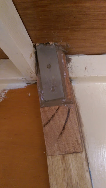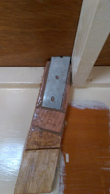 In order to ensure I glue it on in the correct place I used a few pieces of scrap wood to get the alignment right. As usual the existing support timber ISN'T ON STRAIGHT. So I've lifted the right hand side of the new piece about 2mm as a fudge. Not enough to notice that it's not parallel to the other one, and not enough to notice that it's not parallel with the top of the transom (just don't look too hard).