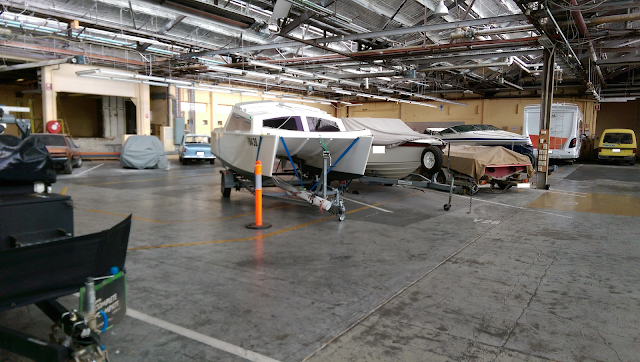 Kismet in storage with my $85 eBay telescopic ladder. (Since taking this picture I have since roped the ladder to the boat for a bit of security while getting on and off.)